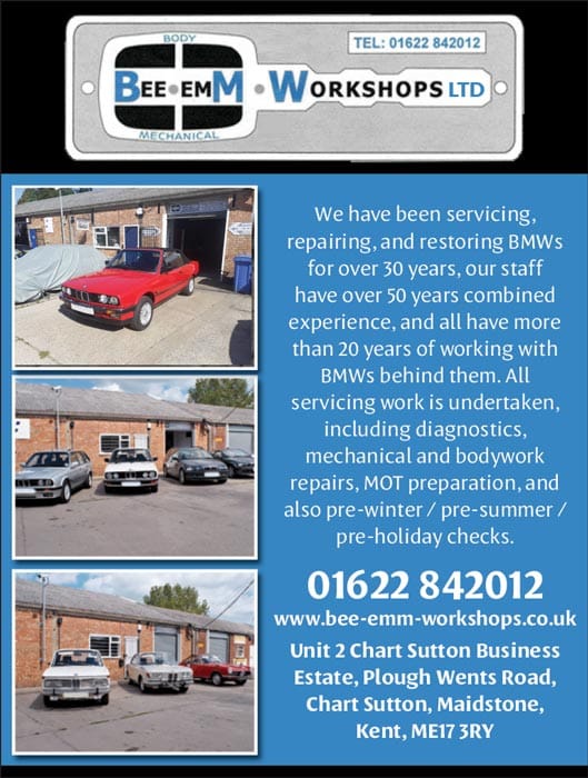 We at the Bee Emm Workshop are a professional and friendly garage in Maidstone who provide all types of servicing work on both classic and modern cars including; diagnostics, mechanical and bodywork repairs, MOT preparation, and pre-winter / pre-summer / pre-holiday checks. We have many years of experience in working on full or partial restoration projects for Historic and Classic BMWs, including preparation for Rallies and Touring events.