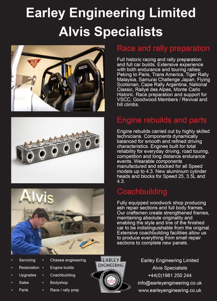 At Earley Engineering Limited, we’re an independent team of Alvis specialists committed to all aspects of Alvis car care. From sales to maintenance, repairs to restoration, and competition preparation, we handle it all. Our expertise spans vintage four-cylinder models from the 1920s to iconic Speed 20s, Speed 25s, and 4.3 Litre models of the 1930s, as well as elegant Three Litres and 1960s Park-Ward series cars. Whether it’s minor repairs, full restoration projects, accident repairs, resprays, or mechanical upgrades, our services cover the spectrum. Additionally, we craft and sell precision-made components and provide support for international rallies, races, and events. With a comprehensive Alvis and classic car sales service, we’re your one-stop destination for all your Alvis car needs.